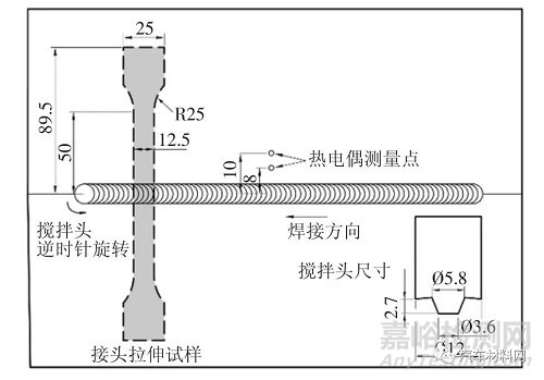 圖1 攪拌摩擦焊接拉伸試樣尺寸、攪拌頭尺寸及熱電偶測量點布置圖(單位:mm)