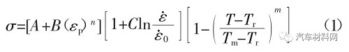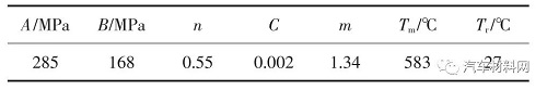 式中:A 為參考溫度和應(yīng)變率下初始屈服應(yīng)力;B 為材料應(yīng)變硬化模量;n 為硬化指數(shù);C 為材料應(yīng)變率強化參數(shù);m 為材料軟化系數(shù);εp 為塑性應(yīng)變;ε為應(yīng)變速率;