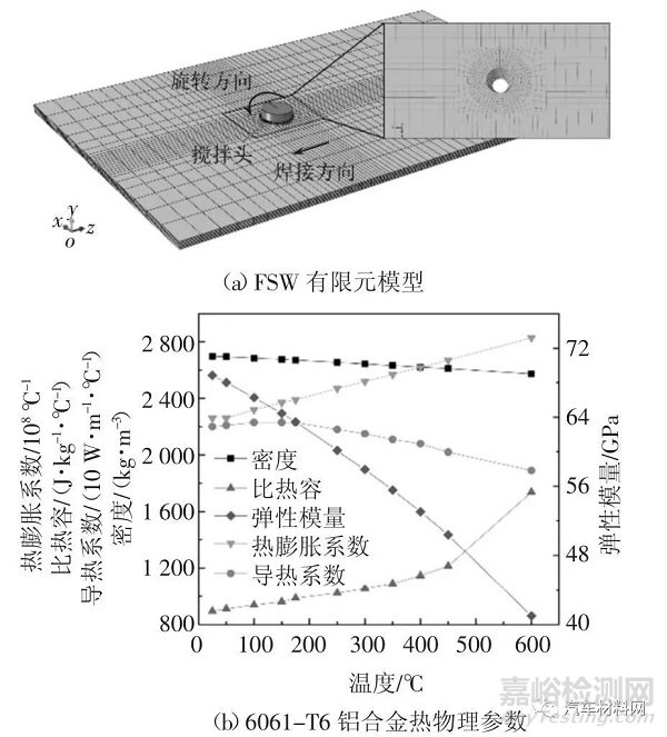 圖2 FSW 有限元模型及6061-T6 鋁合金熱物理參數(shù)