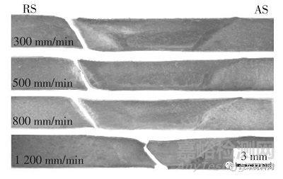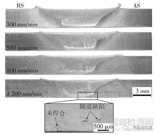 1)焊接速度過高,將影響焊縫的成形性.當(dāng)焊接速度為300~800 mm/min 時,接頭成形質(zhì)量良好.當(dāng)焊接速度為1 200 mm/min 時,由于焊速過快,焊核區(qū)下表面升溫不足,材料熱塑性不足,使得材料攪拌不充分,形成未焊合及隧道缺陷.