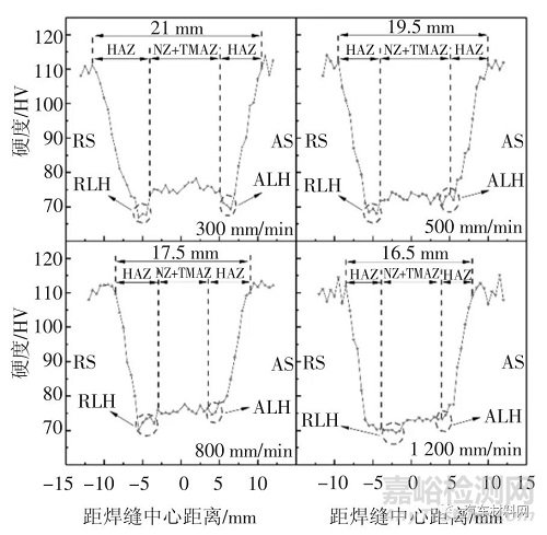圖4 為不同焊接速度的FSW 接頭橫截面中心硬度分布,將后退側(cè)、前進側(cè)硬度最低區(qū)域分別用RLH(Retreating side Low Hardness)、ALH(Advancing side Low Hardness)表示.熱力影響區(qū)(Thermo-mechanical Affected Zone,TMAZ)寬度較窄[7],其硬度難以測試.當(dāng)焊接速度從300 mm/min 增加到1 200 mm/min,焊縫及軟化區(qū)域的寬度明顯變窄,從21 mm減小到16.5 mm;焊核區(qū)(Nugget Zone,NZ)的硬度分布在70~78 HV 之間,隨著與焊縫中心的距離增加,硬度開始略微下降,除1 200 mm/min 試樣外,均在后退側(cè)距焊縫中心線5.5 mm 位置附近達到最低值,之后硬度逐漸恢復(fù)至母材水平.300 mm/min 試樣RLH和ALH 硬度較其他試樣差異較小,硬度曲線呈較明顯的“W”形,其他焊接速度下ALH 硬度略高于RLH硬度,這與荊洪陽等[17]和Liu 等[18]的研究結(jié)果一致.