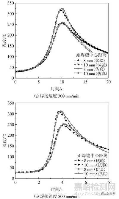 為了驗證仿真模型計算得到的溫度場結(jié)果的準確性,將其與實測溫度對標(biāo),如圖7 所示.當(dāng)焊接速度為300 mm/min 時,在距離焊縫中心8 mm、10 mm位置,仿真得到的峰值溫度分別為324 ℃、259 ℃,試驗測得的峰值溫度分別為316 ℃、256 ℃,其誤差分別為2.53%、1.17%;當(dāng)焊接速度為800 mm/min 時,仿真得到的峰值溫度分別為310 ℃、251 ℃,試驗測得的峰值溫度309 ℃、245 ℃,其誤差分別為0.32%、2.45%.由此可見,仿真與試驗峰值溫度吻合程度較高,溫度上升曲線一致.由于無法考慮實際中工件和工裝、平臺之間復(fù)雜的接觸關(guān)系,降溫曲線差異較大.但本文主要研究接頭不同區(qū)域峰值溫度,對于降溫曲線計算可在后續(xù)研究中進一步優(yōu)化.