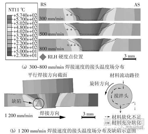 圖8 FSW 接頭橫截面溫度場分布及缺陷圖