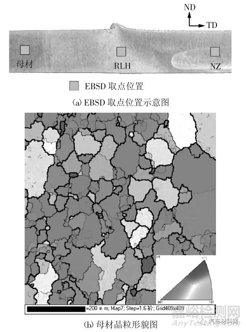 圖9 EBSD 取點位置及母材晶粒形貌圖