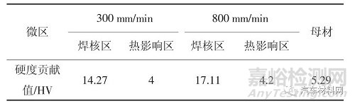 表3 不同焊接速度樣品焊核區(qū)以及熱影響區(qū)的平均晶粒尺寸及其對硬度的貢獻