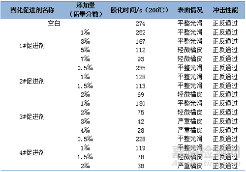 由表2可以看出,聚酯本身在不添加固化促進(jìn)劑的情況下也能夠固化完全,表面效果良好,沖擊性能正常,膠化時(shí)間偏長;添加不同固化促進(jìn)劑后,不同促進(jìn)劑的促進(jìn)效果不同,隨著促進(jìn)劑添加量的提升,膠化時(shí)間縮短,表面效果逐漸變差,沖擊均能通過;由圖1可以看出,相同添加量的不同固化促進(jìn)劑其促進(jìn)效果不同,1#促進(jìn)劑效果最差,4#效果最優(yōu),符合表2數(shù)據(jù)情況。
