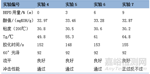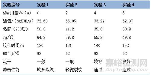 綜合上述實(shí)驗(yàn)結(jié)果,實(shí)驗(yàn)6制備得到的聚酯樹脂能夠?qū)崿F(xiàn)表面良好、沖擊性能通過的低溫固化粉末。