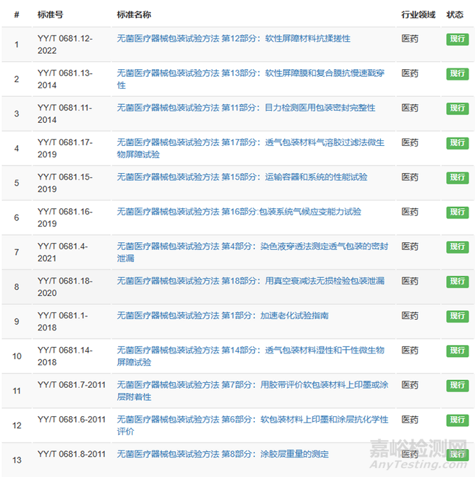 對(duì)于無菌醫(yī)療器械包裝試驗(yàn)方法 參考YY/T 0681系列標(biāo)準(zhǔn)。