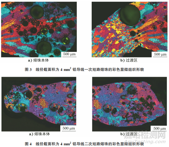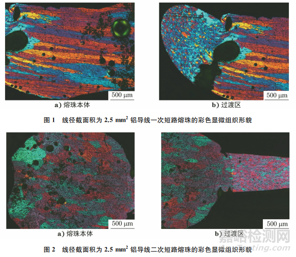 圖1~2為線徑截面積為2.5mm2 鋁導(dǎo)線一次短路熔珠與二次短路熔珠的彩色顯微組織形貌。由圖1~2可知:一次短路熔珠的晶粒主要為柱狀晶,晶粒細長,且具有明顯的方向性,等軸晶較少,晶粒內(nèi)部的枝晶組織不明顯,組織中含有一定數(shù)量的氣孔,氣孔形狀較規(guī)則;二次短路熔珠的晶粒為粗大的等軸晶,晶粒沒有明顯的方向性,晶粒內(nèi)部的枝晶組織不明顯,組織中含有一定數(shù)量的氣孔,二次短路熔珠氣孔形狀較一次短路熔珠氣孔形狀的規(guī)則性差。