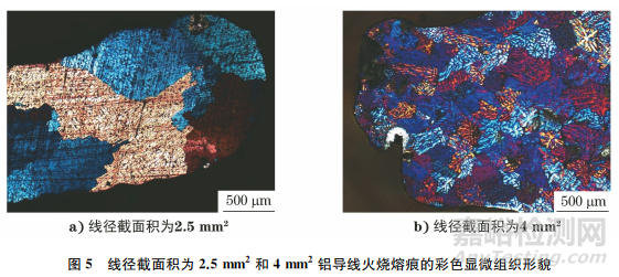 圖5為線徑截面積為2.5mm2和4mm2鋁導(dǎo)線火燒熔痕的彩色顯微組織形貌。由圖5可知:線徑截面積為2.5mm2和4mm2鋁導(dǎo)線火燒熔痕的晶粒為等軸晶,熔痕內(nèi)部未見氣孔,晶粒內(nèi)部存在枝晶組織,其中線徑截面積為4mm2鋁導(dǎo)線的火燒熔痕中的枝晶組織更加明顯。