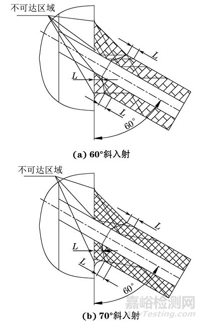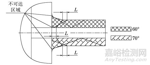 該類結(jié)構(gòu)僅能從單邊外側(cè)采用不同斜射角度對垂直支管、斜交支管進(jìn)行掃查。由于探頭前沿以及結(jié)構(gòu)形式的限制,直射波法和一次反射波法均存在不可檢區(qū)域,直射波法的不可檢區(qū)域較大。從圖1和圖2可以看出,隨著斜射角的增大,不可檢區(qū)域減小,且垂直連接的不可檢區(qū)域要小于斜交連接的不可檢區(qū)域。另外從圖2可以看出,單邊單側(cè)掃查時銳角側(cè)不可檢區(qū)域小于鈍角側(cè)的不可檢區(qū)域。