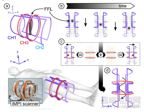 MPI是一種基于磁性納米粒子直接可視化的技術(shù),其不是基于正電子發(fā)射斷層掃描等放射性標(biāo)記物對伽馬射線的檢測,而是基于磁性納米顆粒對隨時間變化的磁場的響應(yīng)信號。其能利用了注入血流中的納米顆粒示蹤劑的磁性特點,生成動脈血流運動的實時三維圖像。在德國維爾茨堡大學(xué)的研究人員開發(fā)便攜式掃描儀(iMPI)之前,已經(jīng)很多研究團隊開發(fā)出MPI,并在動物上成功應(yīng)用。但是之前研發(fā)團隊開發(fā)出的MPI設(shè)備不是太大就是太小。大的體積非常龐大,而且價格非常昂貴沒有商業(yè)化的潛力。而小的只能用于小型嚙齒類動物,人根本無法使用。