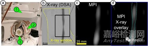 iMPI的內(nèi)孔直徑約為 20 厘米,F(xiàn)OV 區(qū)域為橢圓管形式(長度約為 25 厘米,小直徑約為 10 厘米,大直徑約為 20 厘米),組裝好的 iMPI提供的梯度強度為高達 0.36 T/m(70% 功率時為 0.25 T/m)和每秒最多 8 幀的實時可視化。生成的磁場達到約35mT (70mT pp) 的最大幅度。約 14 kW 的功耗會在連續(xù)成像過程中導(dǎo)致溫度急劇升高。