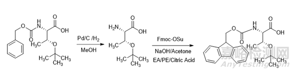 根據(jù)ICHQ3D、USP<232>、USP<233>的要求,應(yīng)對(duì)所有API的元素雜質(zhì)進(jìn)行評(píng)估。從ICHQ3D中的附圖可知,藥品中的元素雜質(zhì)可能來(lái)自于API,而起始物料中的元素雜質(zhì)也有傳遞到API中的風(fēng)險(xiǎn)。因此,應(yīng)對(duì)起始物料中的元素雜質(zhì)進(jìn)行評(píng)估與控制,特別是對(duì)于那些在生產(chǎn)工藝中使用金屬催化劑的起始物料。例如Fmoc-Thr(tBu)-OH的合成過(guò)程中需要用到金屬鈀催化脫除Cbz保護(hù)基圖5,根據(jù)ICHQ3D的要求,金屬鈀屬于2B類元素雜質(zhì),若在工藝中有意添加,無(wú)論何種給藥途徑都需要研究。