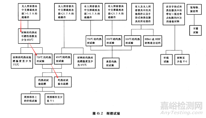 如果X電容外殼材料是較不耐燃的,GWT750℃灼熱絲試驗(yàn)時(shí)有超過2秒燃燒,則以電源軟線藍(lán)色N線與PCB快速插片連接為例,除了白色護(hù)套X電容GWT750℃灼熱絲試驗(yàn)外,快速插片連接該連接件上方直徑20mm高50mm的圓柱體范圍內(nèi)的其他部件經(jīng)受針焰試驗(yàn),例如圖1藍(lán)圈范圍內(nèi)黑色PP外殼要針焰試驗(yàn),GB 4706.1-2005標(biāo)準(zhǔn)流程如圖3所示。