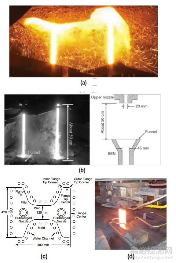 異形坯連鑄誕生于1968年,從那時起到現(xiàn)在已經(jīng)安裝了約60套異形坯連鑄機,本文展示異形坯缺陷文獻回顧,主要集中在缺陷的形成機理,提出降低缺陷的解決措施。表面缺陷包括縱向裂紋和橫向裂紋,內(nèi)部缺陷是氣泡和凝固過程產(chǎn)生的裂紋,展望包括調(diào)查缺陷使用的技術(shù):金相組織調(diào)查,計算流體動力學,熱力學和熱機模型等。連鑄工序采取的措施,改進浸入式水口(SEN)設(shè)計,二冷修改和校準儀器儀表,弧形段支撐等。