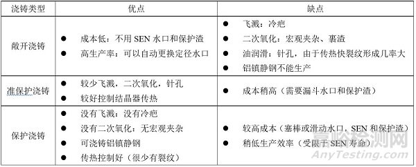 異形坯可以敞開澆鑄,準保護澆鑄和保護澆鑄,這三種形式澆鑄方式見圖1所示,每一種方式都有其優(yōu)缺點,見表1。敞開澆鑄一般用于小斷面異形坯,盡管也有使用單水口澆鑄方式,但是通常每個結(jié)晶器采用兩個定徑水口來澆鑄。對于敞開澆鑄的定徑水口已經(jīng)可以進行自動快速更換。敞開澆鑄簡單,生產(chǎn)效率較高,但是敞開澆鑄遇到的問題是鋼水中的硅和錳的二次氧化,也有在結(jié)晶器使用喂入鋁絲來加強脫氧形成的氧化鋁。敞開澆鑄遇到的質(zhì)量問題見表1。