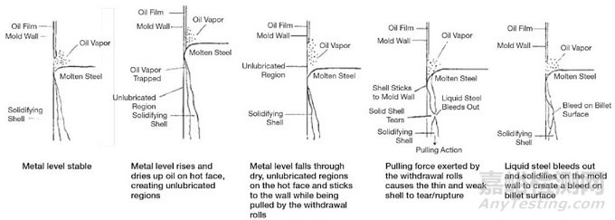在鑄坯上出現(xiàn)小的漏鋼,但是馬上冷卻愈合,沒有形成事故和金屬損失。發(fā)生在異形坯這個缺陷的例子見圖4,這是由于結(jié)晶器內(nèi)異形坯熱區(qū)環(huán)狀應(yīng)變所致,或者粘結(jié)導致。在油潤滑敞開發(fā)生的機理見圖5所示。