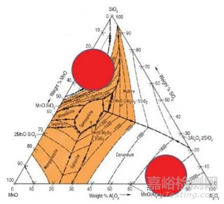 在敞開澆鑄鋼水和大氣以及氧化渣接觸形成泡沫浮渣,這個浮渣內(nèi)通常含有硅酸錳,如果硅含量過高(由于低的Mn/Si比),發(fā)生氧化硅的析出,導致高的黏度,浮渣進入異形坯表面的危險增加,特別嚴重情況下將發(fā)生漏鋼事故。另外向結(jié)晶器內(nèi)喂入鋁絲也造成浮渣的高黏度,高黏度浮渣不能避免,難以達到理想正確的位置上,這兩種情況概況在圖6中的SiO2-MnO-Al2O3三元相圖中。