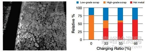 這些裂紋與鋼中的銅含量相關(guān),用高比例廢鋼冶煉鑄坯一般銅含量偏高,在坯殼與銅板或銅管之間的氣隙增大,晶粒尺寸變大,假如銅含量高,這個地方會產(chǎn)生裂紋。圖7所示是Dragon鋼廠軋制后的H型鋼表面網(wǎng)狀裂紋。在這個鋼廠銅含量控制<0.15%,為了達到這個要求,電爐冶煉中使用較高比例的鐵水,鋼中的銅含量與加入的廢鋼類型和品質(zhì)有關(guān),見圖7裝入比例示意。