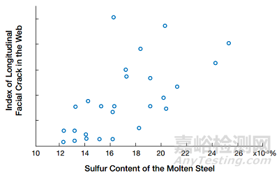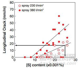 二冷過程:增加二冷強度反而增加了縱裂形成的傾向,在Kawasaki鋼廠(現(xiàn)在的JFE鋼廠)表明這個關(guān)系,對于硫含量的影響也已經(jīng)進行了討論,見圖12。