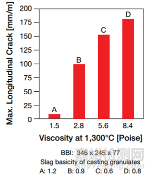 圖10 在StahlwerkeThuringen鋼廠使用不同保護渣,小斷面異形坯低拉速(低于1m/min),檢驗對縱向裂紋形成的影響
