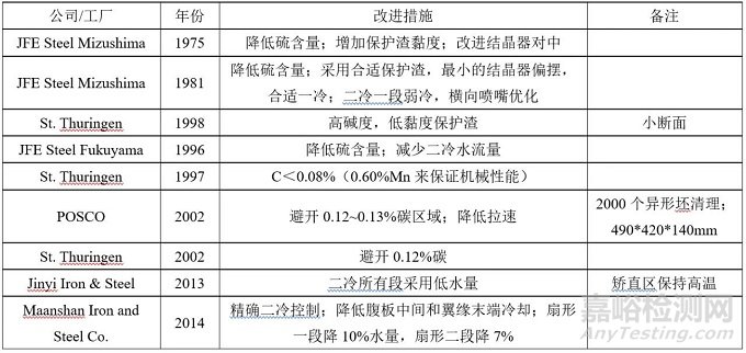 廣泛使用數(shù)學模型來發(fā)現(xiàn)和解決缺陷問題,例如,Jin Yi鋼鐵公司使用模型來優(yōu)化二冷以避免這些裂紋,他們使用的是ANSYS軟件進行熱機模型計算,用MATLAB軟件優(yōu)化參數(shù)。中國的馬鞍山鋼鐵公司考慮到所有的傳熱機理,完全使用優(yōu)化的二冷模型來達到避免縱裂產(chǎn)生(見圖13)。這些經(jīng)驗概況在表2中,它們的作用可以劃分為:(a)冶金因素:較低硫含量;避免包晶相變的成分;(b)保護渣:使用高堿度保護渣和均勻傳熱效果;(c)結(jié)晶器設(shè)計:避免腹板和翼緣連接處的縱向裂紋;(d)二冷過程:二冷一段采用弱冷;良好的橫向噴嘴分布。