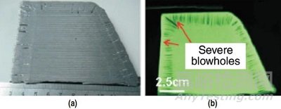 圖14 異形坯氣泡:a是橫向低倍,b是放射探傷照片