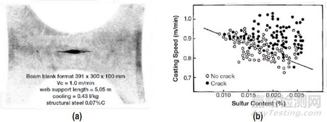 日本Mitzushima鋼廠和Kawasaki鋼廠報告了一種中心裂紋案例,該鑄機基本半徑是12.5m,采用漏斗水口保護渣澆鑄400x460x120mm異形坯和287x560x120mm異形坯,圖17b給出了硫含量和拉速的影響,通過強化腹板處的冷卻和嚴格加持輥縫檢查解決了這個問題。