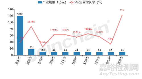 據(jù)統(tǒng)計(jì),2022年,陜西省內(nèi)產(chǎn)業(yè)規(guī)模排名第一的是西安市,產(chǎn)業(yè)規(guī)模達(dá)120.21億元,2018-2022年的復(fù)合增長(zhǎng)率為11.18%;咸陽(yáng)市和寶雞市分別以18.99億元和10.3億元位列第二、第三,2018-2022年復(fù)合增長(zhǎng)率分別為25.11%和7.36%。