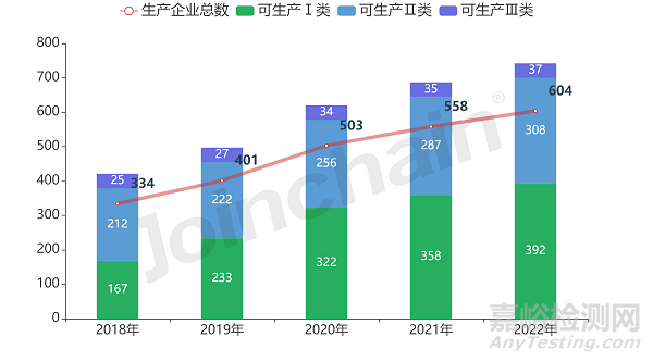 據(jù)統(tǒng)計(jì),2022年陜西省生產(chǎn)企業(yè)數(shù)為604家,其中可生產(chǎn)Ⅰ類產(chǎn)品的企業(yè)有392家,可生產(chǎn)Ⅱ類有308家,可生產(chǎn)Ⅲ類的企業(yè)有37家。