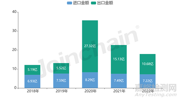 圖表6 2018-2022年陜西省醫(yī)療器械進(jìn)出口趨勢(shì)(億元)