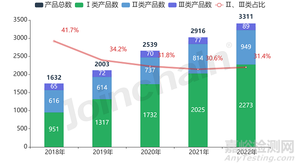 據(jù)統(tǒng)計(jì),2022年陜西省產(chǎn)品注冊(cè)備案存量有3311件,其中Ⅰ類產(chǎn)品數(shù)量為2273件,Ⅱ類和Ⅲ類產(chǎn)品數(shù)量分別為949件和89件,Ⅱ類、Ⅲ類產(chǎn)品數(shù)量占比為31.4%。