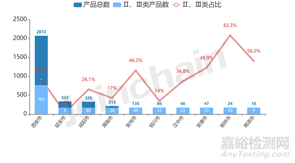 據(jù)統(tǒng)計(jì),2022年陜西省醫(yī)療器械產(chǎn)品注冊(cè)備案總量排名第一的是西安市,產(chǎn)品注冊(cè)備案數(shù)為2072件,全省占比為62.6%,其中,Ⅱ、Ⅲ類產(chǎn)品數(shù)量為765件,Ⅱ、Ⅲ類占比為36.9%;延安市和咸陽(yáng)市位列第二、第三,產(chǎn)品注冊(cè)備案數(shù)分別為332件和326件,全省占比分別為10.0%和9.8%。