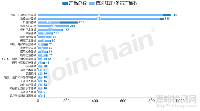 據(jù)統(tǒng)計(jì),2022年陜西省產(chǎn)品注冊(cè)備案總量最多的產(chǎn)品類別是注輸、護(hù)理和防護(hù)器械,達(dá)934件,占比28.21%,其中,首次注冊(cè)或首次備案的產(chǎn)品數(shù)為881件。其次是物理治療器械和口腔科器械,分別為885件和281件,占比分別為26.73%和8.49%。