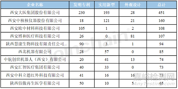 據(jù)統(tǒng)計(jì),醫(yī)療器械生產(chǎn)企業(yè)中,2018-2022年專利發(fā)布數(shù)量全省排名第一的是西安大醫(yī)集團(tuán)股份有限公司,共計(jì)451件;西安中核核儀器股份有限公司和西安歐中材料科技有限公司分別位列第二、第三,專利發(fā)布數(shù)量分別為160件和108件。