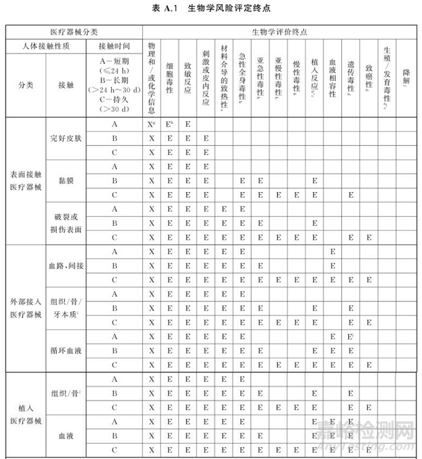 至于詳細(xì)的生物學(xué)試驗(yàn)需要進(jìn)行哪些,這里不過多介紹,大家參照最新的GB/T 16886.1-2022(2023年5月1日生效)附錄A 生物學(xué)風(fēng)險評定涉及的終點(diǎn),根據(jù)醫(yī)療器械分類(人體接觸類型及接觸時間)選擇對應(yīng)的生物學(xué)評價終點(diǎn)(即生物學(xué)試驗(yàn)項(xiàng)目),如下表所示。