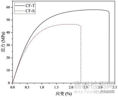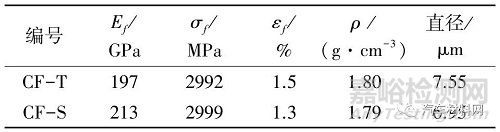 兩種碳纖維的性能指標(biāo)見(jiàn)表2,表中Ef為拉伸模量;σf為拉伸強(qiáng)度;εf 為伸長(zhǎng)率;ρ 為密度。從表中數(shù)據(jù)可以看出:CF-T 材料的單絲拉伸模量和伸長(zhǎng)率略大于CF-S,直徑略粗于CF-S,但是區(qū)別并不明顯,從力學(xué)性能和纖維尺寸上看兩種碳纖維屬于同一級(jí)別碳纖維,沒(méi)有出現(xiàn)較大的性能差異。
