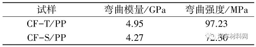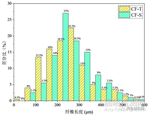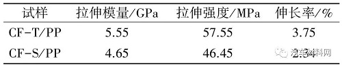 (1)兩種碳纖維單絲的力學(xué)性能相同,且復(fù)合材料中的剩余纖維長(zhǎng)度分布狀態(tài)接近,可以排除碳纖維本身的力學(xué)性能和剩余纖維長(zhǎng)度這兩種因素對(duì)復(fù)合材料產(chǎn)品力學(xué)性能的影響。