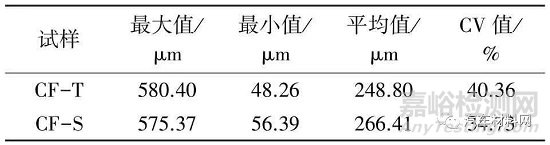 CF-T/PP 與CF-S/PP 兩種復(fù)合材料均通過(guò)相同的注塑工藝制備。復(fù)合材料中碳纖維剩余長(zhǎng)度分布的直方圖如圖4 所示。兩種碳纖維材料的長(zhǎng)度均集中在200μm~300μm 之間,長(zhǎng)度最大值均接近600μm,兩種材料中碳纖維剩余長(zhǎng)度值結(jié)果見(jiàn)表3。兩種碳纖維材料的剩余纖維平均長(zhǎng)度結(jié)果接近,表明纖維剩余長(zhǎng)度不會(huì)對(duì)兩種復(fù)合材料力學(xué)性能的差異產(chǎn)生重大影響。