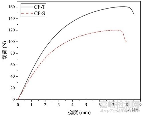 圖6 兩種材料的彎曲載荷-撓度曲線