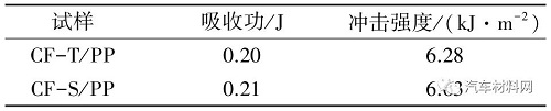 由兩種碳纖維復(fù)合材料進(jìn)行懸臂梁缺口沖擊測(cè)試得到的吸收能量、缺口沖擊強(qiáng)度數(shù)據(jù)如表6 所示??梢钥吹?,兩種材料的吸收功以及沖擊強(qiáng)度并沒(méi)有太大差異。表明兩種材料的抗沖擊韌性水平一致,當(dāng)受到?jīng)_擊載荷時(shí)聚丙烯樹(shù)脂向周?chē)祭w維傳遞同等的沖擊力,兩種材料的吸收能量特性相近。