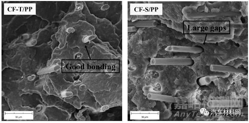 (3)兩種碳纖維表面特征不同,直接導(dǎo)致了復(fù)合材料界面性能的差異。T 公司生產(chǎn)的碳纖維表面經(jīng)過(guò)特殊處理后,碳纖維表面的O/C 元素含量比相較S 公司生產(chǎn)的碳纖維有了明顯增大,纖維表面的活性基團(tuán)明顯增多。CF-T/PP 材料的注塑件中纖維與樹(shù)脂的界面相較于CF-S/PP 材料得到了明顯的改善,纖維與樹(shù)脂間的孔隙減少,界面結(jié)合更加緊密。
