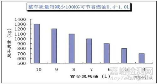 根據(jù)研究數(shù)據(jù)表明,汽車(chē)零部件中應(yīng)用最廣泛的輕量化材料是鋁合金,密度是2.68 g/cm3,鎂合金的密度是1.74 g/cm3。本文所采用的T300 級(jí)碳纖維的密度為1.8g/cm3,制得的CF/PP 復(fù)合材料產(chǎn)品的密度僅有0.95 g/cm3,較鋁合金輕了65%左右,較鎂合金輕了45%左右。根據(jù)圖8 所示的整車(chē)質(zhì)量與百公里耗油的關(guān)系可知,汽車(chē)每減重10%,百公里油耗可減少6%~8%,有害氣體排放量可減少4%。也就是說(shuō),采用上述CF/PP 復(fù)合材料制備汽車(chē)零部件,減重效果可達(dá)到65%以上,而油耗更是可以減少約35%。若是按照每升燃油產(chǎn)生2kg二氧化碳?xì)怏w,則在汽車(chē)零部件的生產(chǎn)中,每使用1kg 復(fù)合材料,可促使汽車(chē)壽命周期中減少超過(guò)20kg 的CO2排放。因此,在汽車(chē)工業(yè)中推廣應(yīng)用CF/PP 復(fù)合材料,不僅能實(shí)現(xiàn)汽車(chē)整車(chē)輕量化,還能達(dá)到顯著的節(jié)能減排效果。