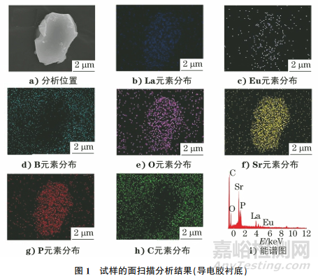 進(jìn)行能譜面掃描分析時(shí),通常會(huì)露出襯底,以形成比較強(qiáng)的對(duì)比,獲得直觀的面掃描譜圖,因此襯底對(duì)能譜分析結(jié)果的影響較大。研究人員選用導(dǎo)電膠、硅片作為襯底,對(duì)含有Sr、La、P、O、Eu、B等6種元素的粉末試樣進(jìn)行面掃描分析,研究了襯底對(duì)粉末試樣能譜分析結(jié)果的影響,并得到了試樣清晰的面掃描譜圖。結(jié)果可為快速選擇合適的襯底、獲得理想的面掃描譜圖提供理論基礎(chǔ)。
