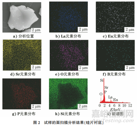 選擇表面平整且導(dǎo)電性良好的硅片作為襯底,將試樣在乙醇溶液中超聲分散,然后滴在硅片上,并進(jìn)行面掃描分析,結(jié)果如圖2所示。由圖2可知:試樣中La、Eu、O、B、P等元素的亮點(diǎn)在有試樣的位置較集中,并形成了一定的對(duì)比度;Sr元素和Si元素的亮點(diǎn)分布情況基本一致,均出現(xiàn)有試樣位置元素的亮點(diǎn)分散,沒有試樣位置元素亮點(diǎn)分布集中的異常現(xiàn)象;Si元素的Kα峰和Sr元素的Lα峰出現(xiàn)重