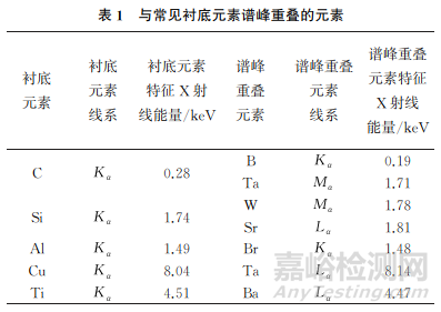 采用線掃描分析方法對(duì)金屬鍍層材料的切面、巖石材料的斷層、多層器件的截面等試樣進(jìn)行能譜分析,該類材料的尺寸較大,襯底對(duì)能譜分析結(jié)果的影響較小。采用點(diǎn)掃描分析方法對(duì)試樣進(jìn)行能譜分析,當(dāng)試樣尺寸較小時(shí),線狀圖中會(huì)出現(xiàn)襯底的特征峰位,襯底對(duì)能譜分析結(jié)果的影響較大;當(dāng)試樣尺寸較大時(shí),線狀圖中未見襯底峰位,襯底對(duì)能譜分析結(jié)果的影響較小。與常見襯底元素譜峰重疊的元素如表1所示。
