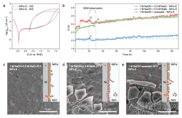 ▲圖2. NiFe-LDH/泡沫鎳陽(yáng)極在含Cl-、含Br-溶液和海水中的腐蝕