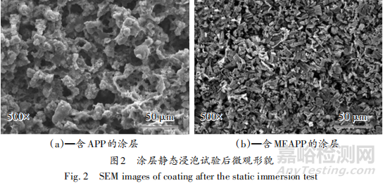 水性防火涂料應(yīng)用在戶外甚至海洋鋼結(jié)構(gòu)上, 其膨脹阻燃體系中的三聚氰胺和季戊四醇微溶于水,將導(dǎo)致涂層與水接觸時(shí),它們?cè)谒邪l(fā)生水解、 遷移,使涂層結(jié)構(gòu)遭到破壞進(jìn)而影響其防火性能,一些學(xué)者通過開發(fā)天然、生物脫水催化劑和成炭劑,其中包括天然纖維、DNA、殼聚糖等,雖然提高了涂層的耐水性,但成本較高,工藝復(fù)雜,不適合用于大型室外鋼結(jié)構(gòu)上,利用微膠囊包覆策略來(lái)提高防火涂層的耐水性是一個(gè)可行的方向。Liu 等將三聚氰胺甲醛(MF)樹脂包覆聚磷酸銨(APP)實(shí)現(xiàn)了APP的微膠囊化(MFAPP),將其應(yīng)用于水性膨脹型防火涂料中。當(dāng)APP和MFAPP在水中浸泡2h后,APP的溶解度為4. 03 g,MFAPP的溶解度為 0. 93 g;浸泡10h后,APP的溶解度逐漸增加到 5. 32 g,而MFAPP溶解度幾乎不變。與含APP的涂層相比,含MFAPP的涂層的耐水性更好,結(jié)構(gòu)更加緊湊、孔洞更少(圖2)。陳中華等用密胺樹脂包覆聚磷酸銨(MF-APP),并用雙季戊四醇(DPER)替代季戊四醇(PER) 制得水性防火涂料,MF-APP 在水中的溶解度為 0. 07g,DPER 分子鏈較 PER 長(zhǎng),具有較低的水溶性, 在水中的溶解度僅為0. 61 g,三聚氰胺(MEL)是非極性分子 ,在水中溶解度為0. 25 g。含有MF-APP/DPER/MEL涂層經(jīng)42h浸水后無(wú)起泡現(xiàn)象,浸水后仍保留較好的防火性能,其鋼板隨時(shí)間背溫變化曲線與浸水前大致相同。密胺樹脂的包覆作用保證了防火涂料在高濕環(huán)境下的防火性能。劉婷婷等通過異丙醇鋁水解制備了一種高耐水性的復(fù)合氫氧化鋁-季戊四醇(ATH-PER),經(jīng)氫氧化鋁(ATH)包覆后 ,溶解度由7. 728 g 降低至 1. 946 g,耐水性能改善顯著。將ATH-PER引入到水性防火涂料中,經(jīng)過24h浸水后,涂有常規(guī)防火涂料的鋼板背板溫度為 194. 2 ℃,炭層膨脹倍率為 2. 14, 而涂覆 ATH-PER 的防火涂料的鋼板背板溫度為 146. 2 ℃,涂層膨脹倍率為 7. 88,表現(xiàn)出更優(yōu)異的耐水性能和耐火性能。綜上可知,微膠囊包覆技術(shù)可利用溶解度低的囊壁如密胺樹脂、ATH、三聚氰胺甲醛樹脂對(duì)溶解度高的囊芯(APP和PER)進(jìn)行包覆,一定程度上降低了涂料成分在水中的溶解度,解決了防火涂層在高濕環(huán)境下成分水解、遷移導(dǎo)致的防火性能下降問題,顯著提高了水性防火涂料耐水性能,其工藝簡(jiǎn)單、成本低,是提高涂層耐水性的有效方法。