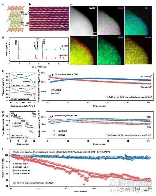 為了解決這個(gè)難題,作者設(shè)計(jì)了一種復(fù)雜的化學(xué)計(jì)量層狀正極,LiNi0.5Mn0.43Ti0.02Mg0.02Nb0.01Mo0.02O2(HE-N50),其設(shè)計(jì)目的是完全消除NMC-532化學(xué)物質(zhì)中的Co含量。適當(dāng)摻雜劑的選擇主要基于三個(gè)原則,首先,已知Ti、Nb和Mo在表面富集以形成均勻且穩(wěn)定的鈍化層;同時(shí),這些元素可以與氧強(qiáng)結(jié)合,從而穩(wěn)定局部晶體結(jié)構(gòu),特別是在較高電壓下;其次,Mg被廣泛報(bào)道為均勻分布在初級(jí)顆粒上并抑制Li+/Ni2+的混合;第三,隨著Mn含量的增加,高價(jià)過(guò)渡金屬離子(如Nb和Mo)的引入可能導(dǎo)致Mn4+的還原。因此,應(yīng)仔細(xì)設(shè)計(jì)摻雜劑的濃度,以避免潛在的相分離。大量Co的消除和顯著增加的Mn含量的穩(wěn)定對(duì)實(shí)現(xiàn)低Ni和無(wú)Co正極提出了前所未有的挑戰(zhàn)。